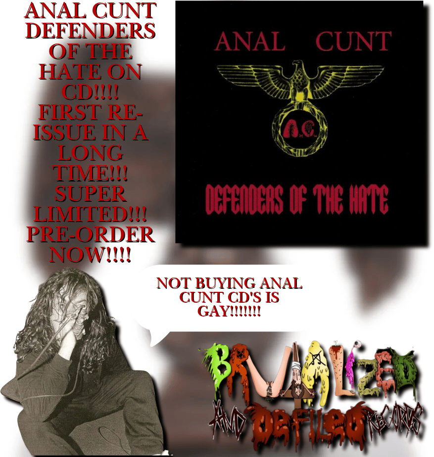 DEFENDERS OF THE HATE BACK ON CD!!!! First re-issue in YEARS!!! A classic within Anal Cunt's discography and Grindcore overall!!! SUPER LIMITED QUANTITY!!!! WON'T LAST LONG FUCKERS!!! PRE-ORDER NOW!!!!